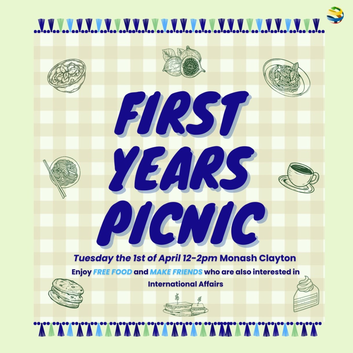 Bring a friend or come as yourself to our First Years Picnic Lunch on Tuesday the 1st of April 12pm-2pm at Monash Clayton! 😊🧺